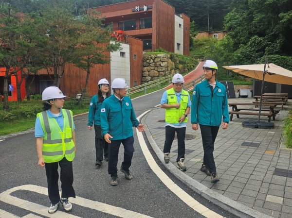 지난 29일 남태헌(가운데) 한국산림복지진흥원장은 국립춘천숲체원을 찾아 태풍 및 집중호우로 인한 안전사고 발생 방지를 위한 안전조치 유무를 점검하였다.