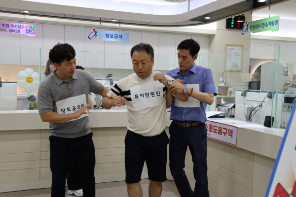 임문희 총무과장은 “앞으로도 정기적인 교육과 모의훈련을 통해 민원 담당 공무원과 주민을 보호할 수 있는 안전한 민원실을 만들기 위해 최선을 다할 것”이라며 “민원인과 공무원이 서로 신뢰하고 존중하는 문화가 정착되길 바란다”라고 말했다.
