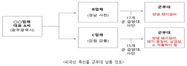 우수사례는 광주광역시 소재 ○○업체는 외국산 돼지갈비, 등갈비, 삼겹살, 차돌박이를 군납 축산가공품 제조업체 2곳에 판매하면서 원산지를 국내산으로 거짓 표시(위반물량: 282톤, 위반금액 28억5천만원)해 적발되어 대표가 구속되었다.