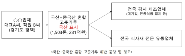 또한 경기도 평택시 소재 ○○고춧가루 제조업체는 중국산과 국산 건고추를 혼합하여 만든 고춧가루를 전국 식자재 전문 유통업체와 김치 제조업체에 판매하면서 원산지를 국산으로 거짓 표시(위반물량: 1,503톤, 위반금액: 231억원)해 적발되어 대표와 공장장이 구속되었다.
