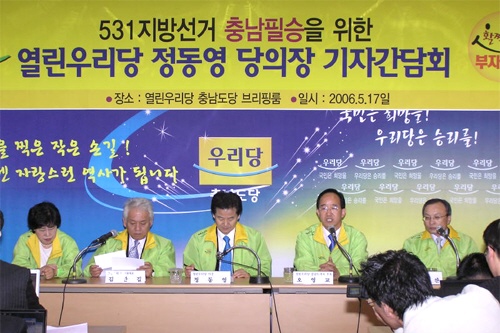 이어 정동영 당의장은 “한나라당과 한나라당 지사와 관련해서는 3가지를 꼭 기억해달라. 행정수도를 헌재에 제소한 정당이 어떤 정당인가? 몸싸움으로 행복도시를 저지하려는 정당이 어떤 정당인가? 행복도시 폐지법안을 낸 정당이 어떤 정당인가?”라고 말했다.