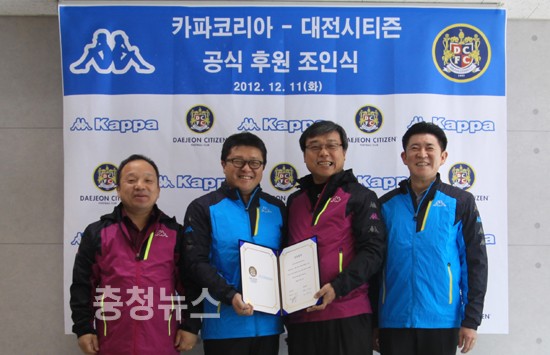 11일 오전 대전시티즌 사무국에서는 카파 박창수 상무이사와 김원서 이사, 대전시티즌 전종구 대표이사와 김춘호 전무가 참석해 공식 용품 후원협약식을 가졌다.