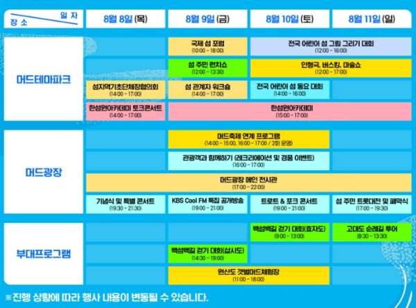 이어 오후 5시부터 10시까지 특성화 사업 홍보 전시관과 한국섬진흥원 홍보부스가 열린다. 여름철 무더위를 고려해 야간으로 운영되며, 행사 마지막 날인 11일까지 방문객들을 맞이할 예정이다.