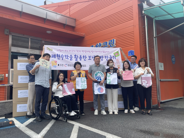 [충청뉴스 권상재 기자] 홍성군과 (사)한국지체장애인협회 홍성군장애인보호작업장 조양크린이 폐현수막 재활용 프로젝트를 성공적으로 마무리하며 8일 폐현수막 보냉가방 전달식을 진행했다.