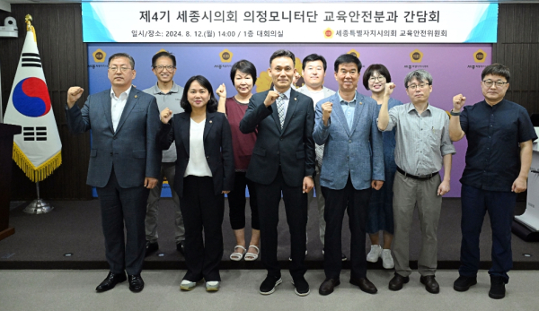 [충청뉴스 최형순 기자] 세종특별자치시의회(의장 임채성) 교육안전위원회(위원장 윤지성)는 12일 의회 청사 1층 대회의실에서 의정모니터단 교육안전분과와 간담회를 가졌다.