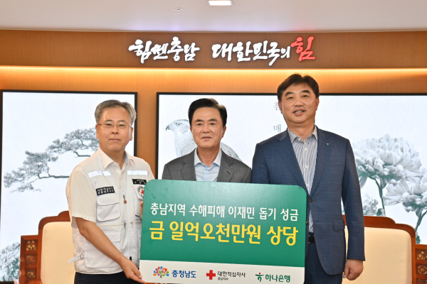 [충청뉴스 권상재 기자] 충남도는 19일 도청 접견실에서 하나은행으로부터 호우 피해 복구를 위한 지정 기탁금 5000만 원과 기부 물품 등 총 1억 5000만 원 상당을 전달받았다.