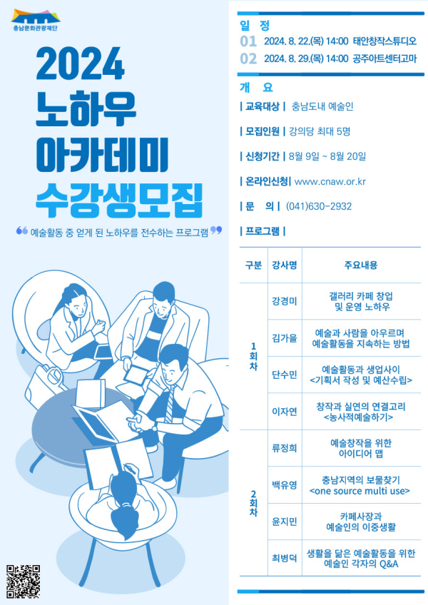 [충청뉴스 권상재 기자] 충남문화관광재단은 지난 19일 예술경험 교환을 통해 예술인의 역량강화와 성장을 지원하는 ‘2024 충남예술인 노하우 아카데미’를 개최한다고 밝혔다.