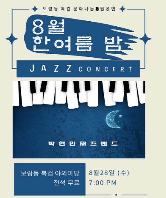박현민 재즈밴드는 귀에 익은 영화 배경음악과 올드팝 등을 연주해 8월 한여름 밤을 감미로운 재즈 선율로 물들일 예정이다.