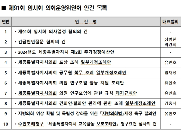 의회운영위원회는 내일 26일부터 9월 9일까지의 임시회 기간 중, 의회사무처 소관 '2024년도 행정사무감사 지적사항에 대한 조치 결과'를 청취하고, '2024년도 제2회 추가경정예산안'을 심사하며, 또한, 조례안 4건과 결의안 1건 등 총 10건을 처리할 예정이다.