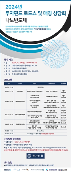 [충청뉴스 이성현 기자] 연구개발특구진흥재단은 반도체, 딥테크, 바이오헬스 분야 특구기업을 대상으로 투자유치 지원을 위한 '2024년 투자펀드 로드쇼 및 매칭 상담회'를 오는 10월까지 총 3회에 걸쳐 릴레이로 추진한다고 밝혔다.