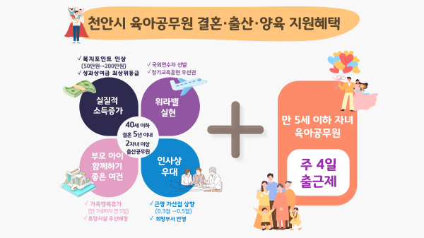 [충청뉴스 박동혁 기자] 충남 천안시는 공무원을 대상으로 다양한 결혼·출산·양육 지원책을 마련했다고 29일 밝혔다.