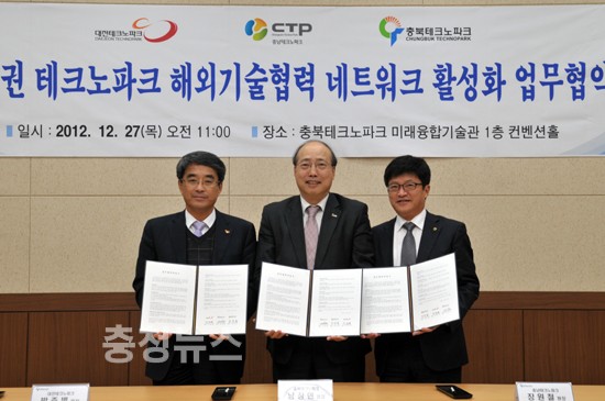 충남테크노파크 장원철 원장은 12월27일 오전 11시 충북테크노파크 컨벤션홀에서 충북테크노파크 남창현 원장과 대전테크노파크 박준병 원장이 참석한 가운데 해외기술협력 네트워크 활성화를 위한 업무협약을 체결하고, 본격적인 활동에 나섰다.