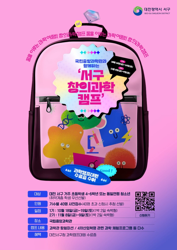 1기 캠프 참가자 모집은 9월 11일부터 온라인 개별 접수로 진행된다. 참가비는 무료이며, 참가 신청은 웹페이지(https://djseogu-science.com/) 또는 QR코드 스캔으로 가능하다.