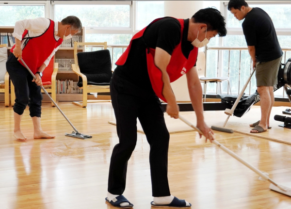오늘 봉사단은 ‘사회복지법인 이화’내에 있는 5개 시설에 팀별로 배분되어 실내외 시설청소, 급식 및 배식, 놀이활동보조, 작업활동보조 등 다양한 형태의 봉사를 실시했다.
