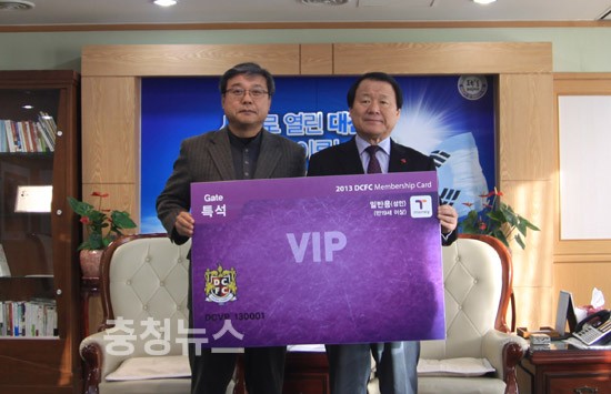염홍철 시장은 지난해에 이어 올해도 연간회원카드 발매 첫날 대전시티즌 연간회원으로 가입하는 동시에 2013시즌 대전시티즌 티켓북 100권을 구매했다.