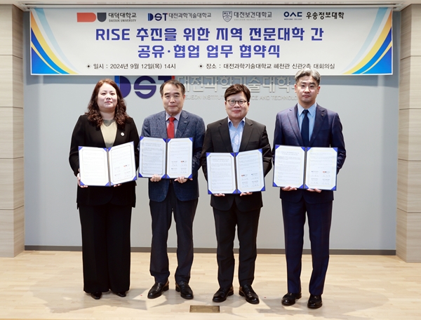 [충청뉴스 이성현 기자] 대전과학기술대학교는 대덕대학교, 대전보건대학교, 우송정보대학 등 대전지역 4개 전문대학 관계자들이 참석한 가운데 2025년 지역혁신중심 대학지원체계(RISE) 공유·협업을 위한 업무협약을 체결했다고 12일 밝혔다.