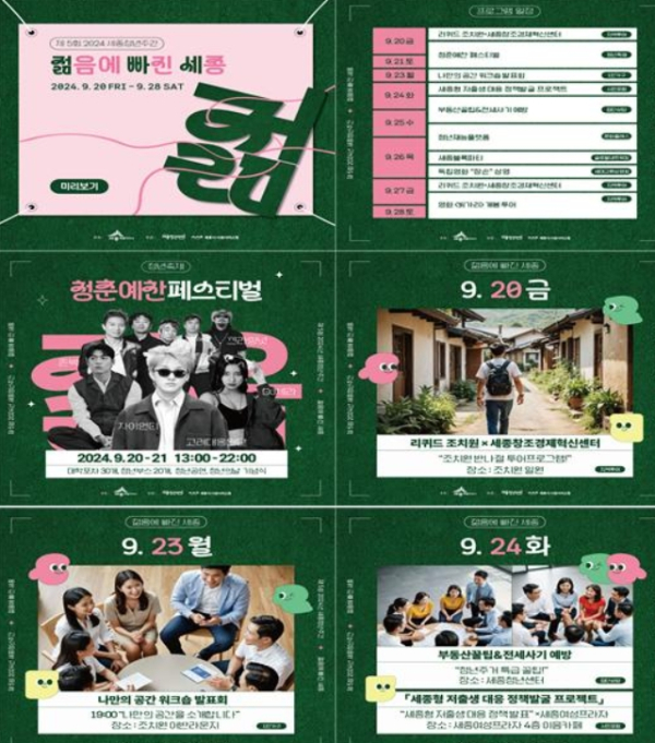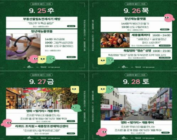 이 밖에 세종청년주간 행사로 다정동 세종청년센터와 조치원읍 일원에서는 ▲1인 청년가구 대상 나만의 공간 워크숍 ▲부동산 꿀팁·전세사기 예방교육 ▲유리공예·그림책 심리코칭 등 원데이 문화클래스 ▲3개 대학 외국인 유학생과 세종청년 간 네트워킹 등 다채로운 프로그램이 진행될 예정이다.