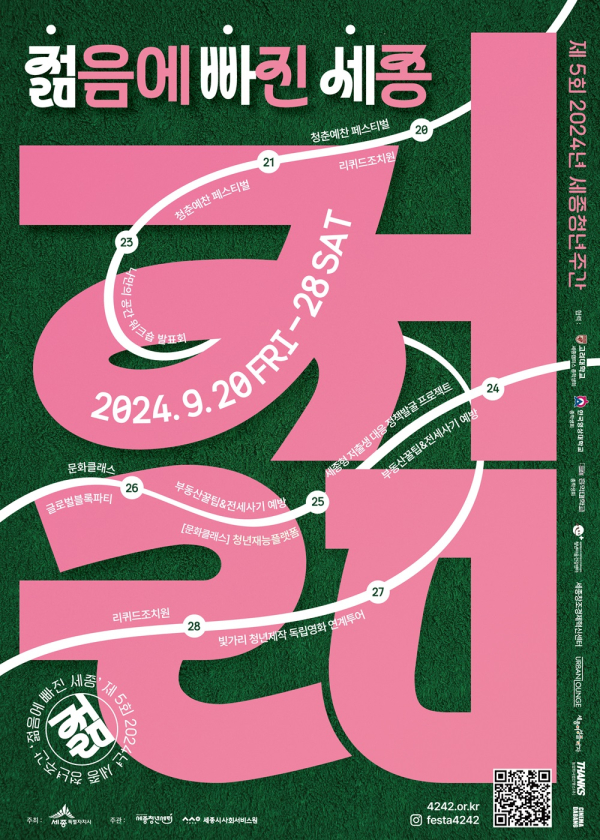 [충청뉴스 최형순 기자] 세종시사회서비스원(원장 김명희)에서 운영하는 세종청년센터(센터장 홍영훈)는 청년의 날을 기념해 ‘2024 제5회 세종청년주간 ‘젊음에 빠진 세종’을 주제로 오는 20일부터 28일까지 메인 페스티벌을 포함한 다양한 프로그램을 진행한다.