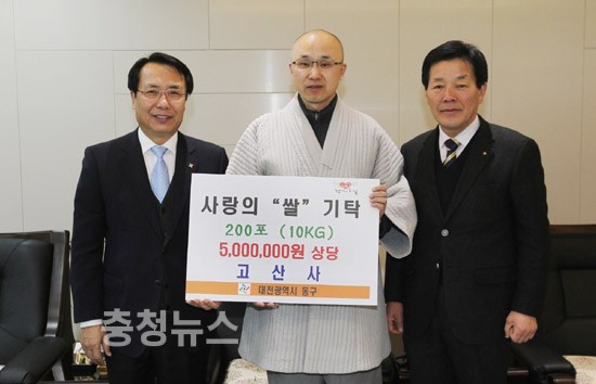 대전 동구 대성동 소재 고산사(주지 선일스님)에서 8일 한현택 동구청장을 찾아 관내 어려운 이웃을 위해 사랑의 쌀(10㎏, 200포 / 약 500만원 상당)을 기탁했다.