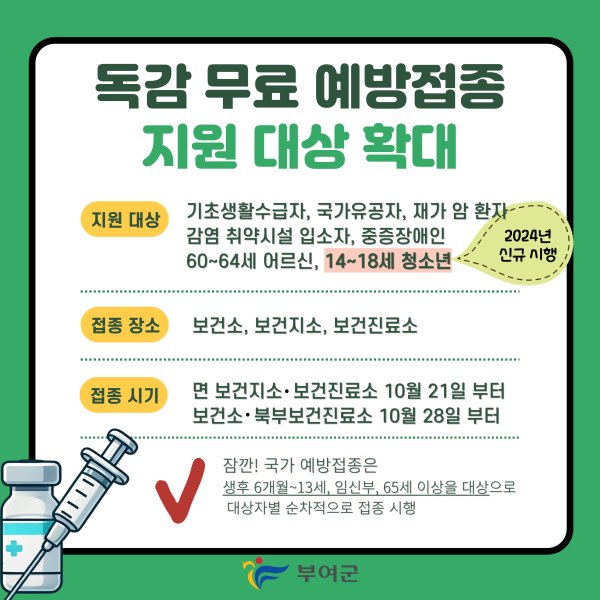 부여군, 독감 예방접종 지원 대상 확대 시행