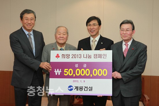 이인구 계룡건설 명예회장은 1월 9일 오후 2시 충남도청을 방문해 안희정 충남도지사와 신한철 충남사회복지공동모금회장 등이 참석한 가운데 ‘희망 2013 나눔 캠페인’ 성금 5천만원을 기탁했다.