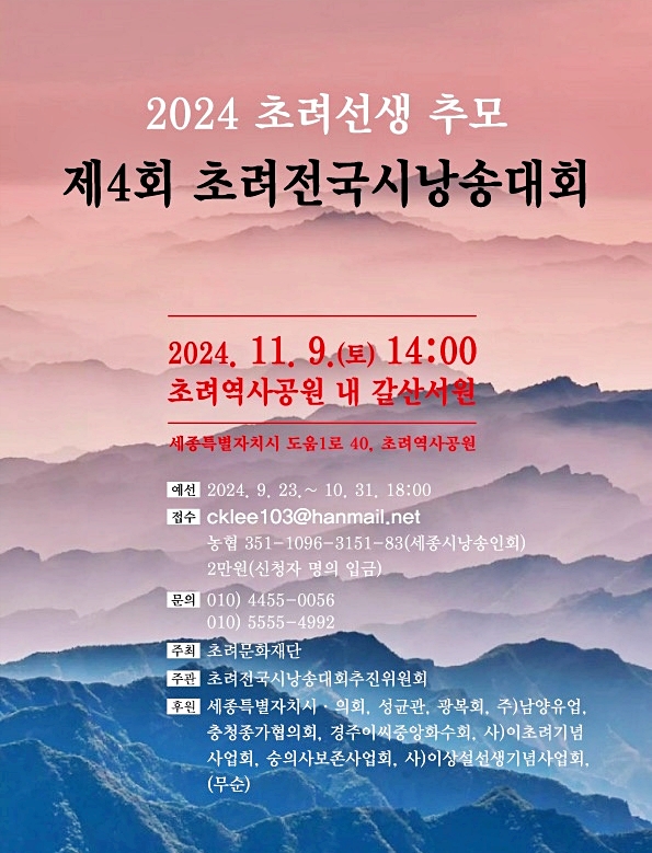 [충청뉴스 조홍기 기자] 세종특별자치시에 있는 초려문화재단(이사장 이연우)이 초려 이유태 선생의 뜻을 기리는 ‘제4회 초려전국시낭송대회’를 개최한다.