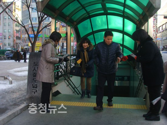 ▲ 9일 오전 8시 시청역 3번 출구에서 우정청 및 대전둔산우체국 직원들이 홍보 안내문을 전달하며 에너지절약을 호소하고 있다.