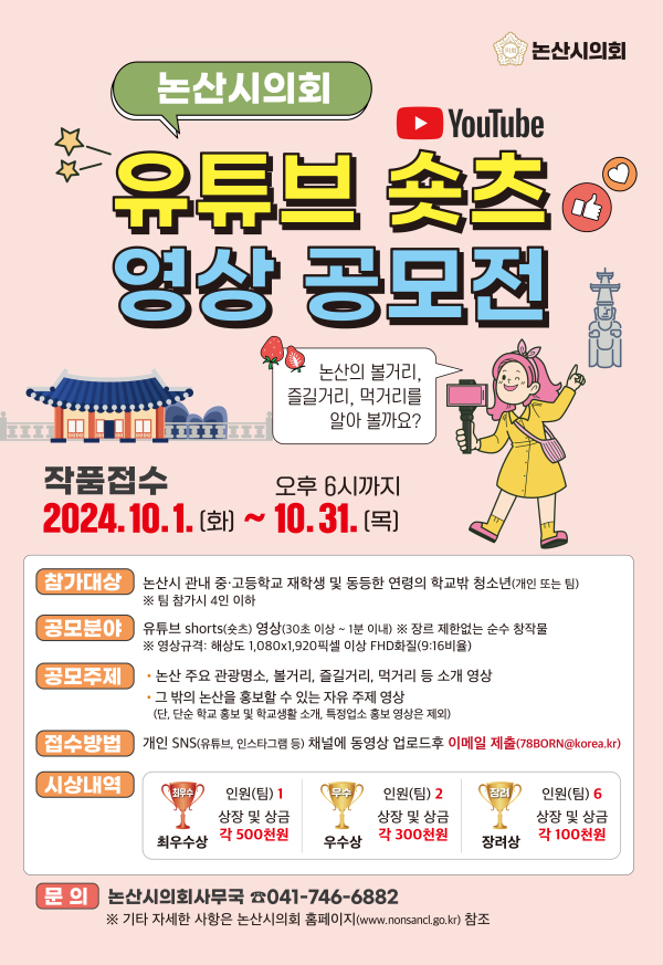 [충청뉴스 논산 = 조홍기 기자] 논산시의회(의장 조용훈)가 관내 중·고등학생을 대상으로 『논산시의회 유튜브 숏츠 영상 공모전』을 개최한다.