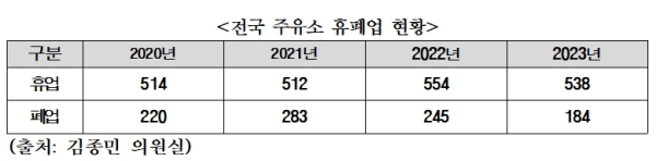 의원실이 한국석유관리원으로부터 받은 국정감사 자료에 의하면 2020년부터 2023년까지 4년간 전국에서 매년 700개가 넘는 주유소가 폐·휴업을 신고했다.