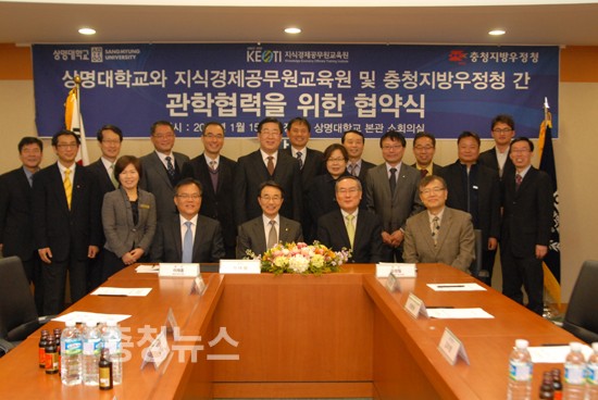 충청지방우정청(청장 이재홍)은 15일 상명대학교 천안캠퍼스에서 우정관련 커리큘럼의 업무전문성 함양 및 지역인재 육성을 위해 지식경제공무원 교육원과 상명대학교와 함께하는 제3자 관학협력 협약(MOU)을 체결했다고 밝혔다.