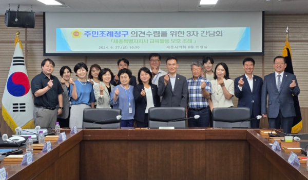 [충청뉴스 최형순 기자] 세종특별자치시의회(의장 임채성) 교육안전위원회(위원장 윤지성)는 주민조례 제정 청구를 통해 발의된 「세종특별자치시 교육활동 보호 조례」의 의견수렴을 위해 청구인, 관계 기관과의 3자 간담회를 27일 실시했다.