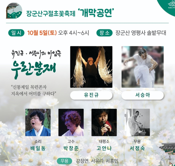 5일 오후 4시~6시까지 영평사 솔밭무대에서 장군산 구절초 꽃축제 “유진규·서승아의 마임극 우란분재” 개막공연이 열린다.