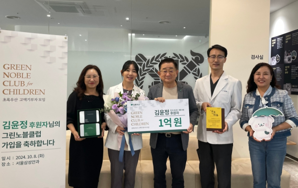 그린노블클럽은 초록우산에 1억 원 이상을 기부하는 고액기부자 모임으로, 서울삼성안과 김윤정 대표원장은 이날 전국 492호, 세종 4호 회원으로 위촉되었다. 이번 약정식에는 김윤정 대표원장과 이홍렬 초록우산 홍보대사를 비롯해 허강철 서울삼성안과 원장, 박미애 초록우산 세종지역본부장, 정선주 초록우산 세종후원회장, 노희헌 초록우산 나눔마케팅본부장 등이 참석하여 자리를 빛냈다.