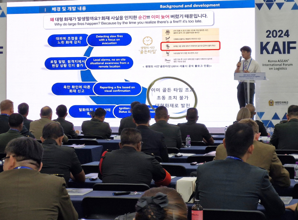 ㈜엘디티는 지난 2~6일 계룡대에서 열린 ‘2024 국제방위산업전시회’에 참가했다. IoT 화재감지시스템에 관한 우수한 기술과 혁신성을 인정받아 기술발표회를 진행하고 있다./엘디티 제공