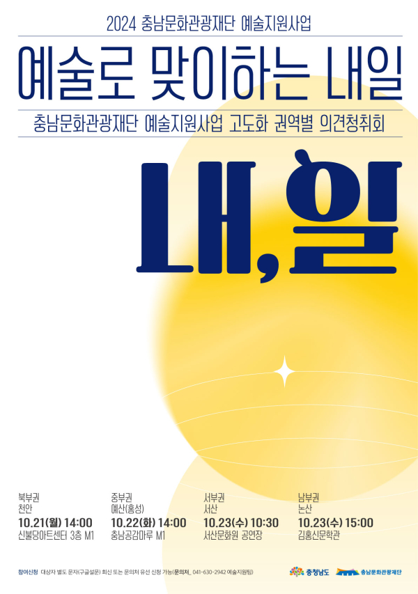 [충청뉴스 권상재 기자] 충남문화관광재단은 오는 21~23일간 천안, 예산(홍성), 서산, 논산을 순회하며‘2024 충남문화관광재단 예술지원사업 의견청취회’를 총 4회 개최해 현장의 다양한 의견을 수렴할 예정이다.
