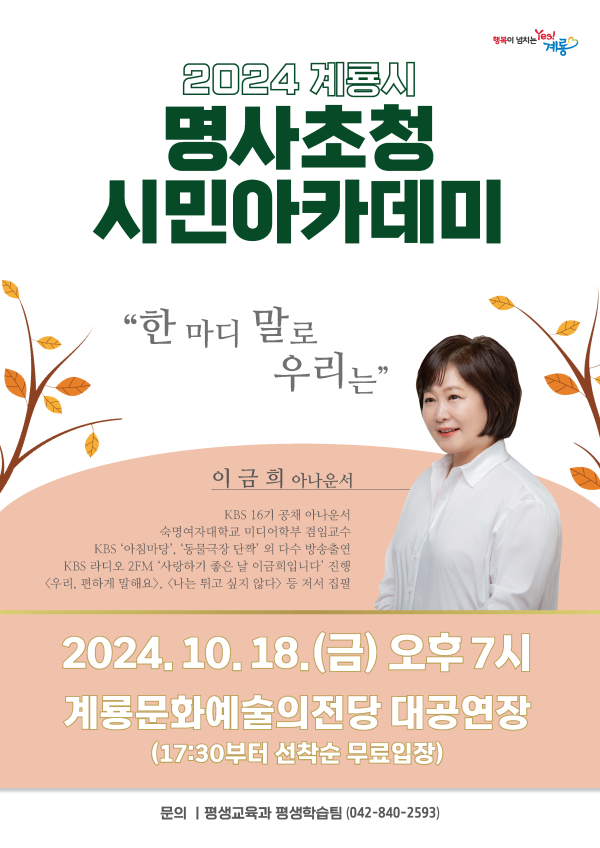 이번 강연은 계룡시민이라면 누구나 참여 가능하며, 사전 신청 없이 오후 5시 30분부터 선착순으로 입장이 진행된다.