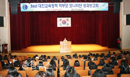 대전시교육청(교육감 김신호)은 2013년 1월 22일 10시 대전평생학습관에서 「Best 대전교육정책 학부모 모니터단 성과보고회」를 개최했다.