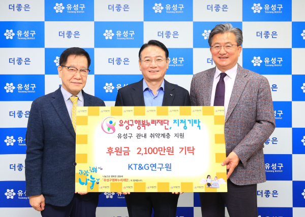 [충청뉴스 박영환 기자] 대전 유성구(구청장 정용래)는 21일 KT&G 연구원(원장 조성문)은 후원금 2,100만 원을 유성구행복누리재단에 기탁했다고 밝혔다.