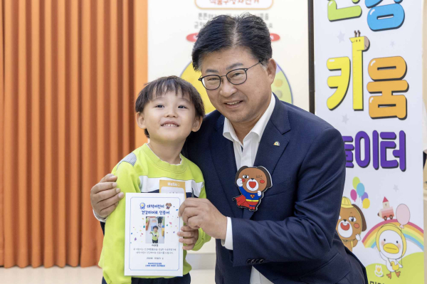 최충규 대덕구청장과 어린이가 ‘대덕어린이 건강히어로 인증서’를 들고 기념사진을 촬영하고 있다.