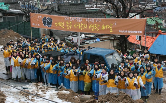 대전시 중구 대사동 고지대 거주 3가구에 연탄 1,200장을 전달하기 위해 학생 150명이 자원봉사에 참여하여 화제가 되었다.
