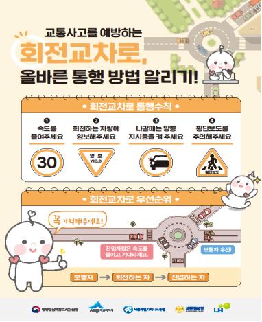 회전교차로는 원형 섬을 반시계 방향으로 회전하며 통과하는 시설로, 진입 시부터 30㎞ 이하로 서행해야 하는 구조로 되어 있다.