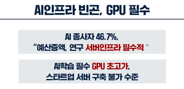 대표적인 GPU인 엔비디아 H100은 5천만 원 내외의 고가로, 스타트업계의 큰 애로 사항의 하나가 인프라 구축으로 꼽힌다. 현재 중기부의 AI스타트업 지원은 해외진출 컨설팅, 상용화 지원 등으로 인프라 직접지원은 예산 항목이 없다.