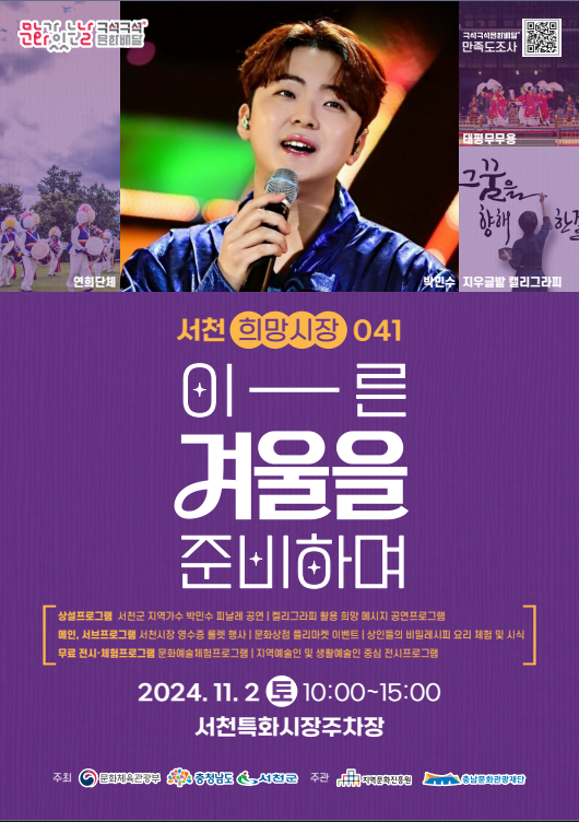 또한 '서천의 아들' 트롯가수 박민수의 축하공연을 통해 특화시장 방문객들과 서천 상인회에 응원과 문화체험의 기회를 제공할 예정이다.