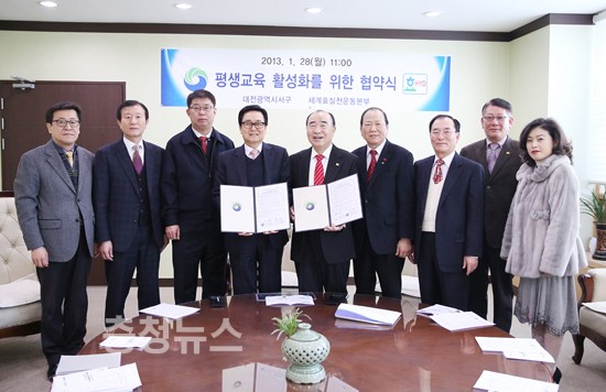 대전광역시 서구(구청장 박환용)는 지난 28일 서구 다목적실에서 지역주민들의 효 문화 확산과 일자리 창출 지원을 위해 세계 효 실천운동본부(총재 오원균)와 ′평생교육 활성화 협약식′을 체결했다.