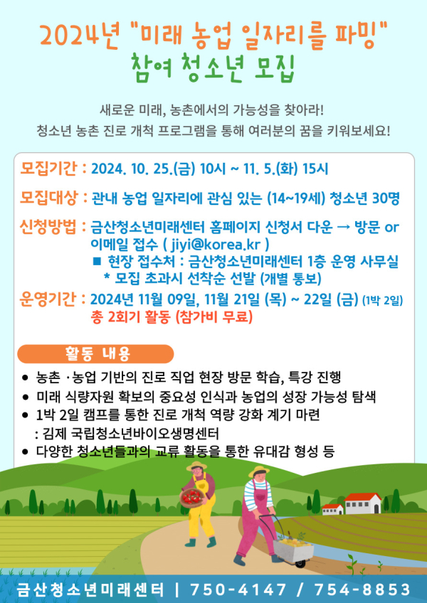 금산군 청소년 농촌 진로 개척 프로그램에 관한 자세한 내용은 금산청소년미래센터(☎041-750-4147)에게 문의하면 된다.