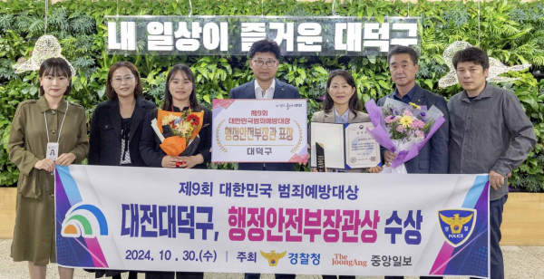 최충규 대덕구청장은 “이번 대한민국 범죄예방대상 행정안전부 장관상 수상은 공직자들과 구민, 단체 모두가 협력해 이뤄낸 쾌거”라며 “더욱 체계적인 시스템을 구축해 모든 주민이 안심하고 생활할 수 있는 안전한 대덕구를 만드는 데 최선을 다하겠다”라고 강조했다.