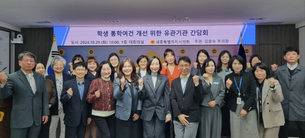 [충청뉴스 최형순 기자] 김효숙 세종시의회(나성동·산업건설위원회 소속) 부의장은 세종시 학교운영위원장협의회(회장 이경진) 학부모나 세종시청, 세종시교육청 관계공무원 등 약 20명이 참석한 가운데 ‘학생 통학 여건 개선 위한 유관기관 간담회’를 지난 29일 의회 1층 대회의실에서 개최했다.
