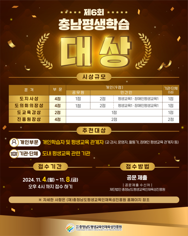[충청뉴스 권상재 기자] (재)충남평생교육인재육성진흥원(이하 진흥원)은 충남 평생교육에 열정과 헌신을 보여준 유공자를 발굴하여 도내 평생교육 문화 확산에 기여하고자 ‘제6회 충남 평생학습대상’을 지난 4일부터 8일까지 추천받는다.
