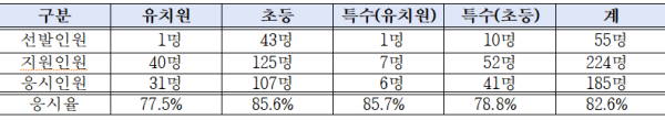 [충청뉴스 이성현 기자] 대전시교육청(교육감 설동호)은 지난 9일, 대전갑천중학교에서 2025학년도 대전 공립 유치원·초등학교·특수학교(유치원·초등) 교사 임용후보자 선정경쟁 제1차 시험 실시 결과, 지원자 224명 중 185명이 응시했다고 밝혔다.