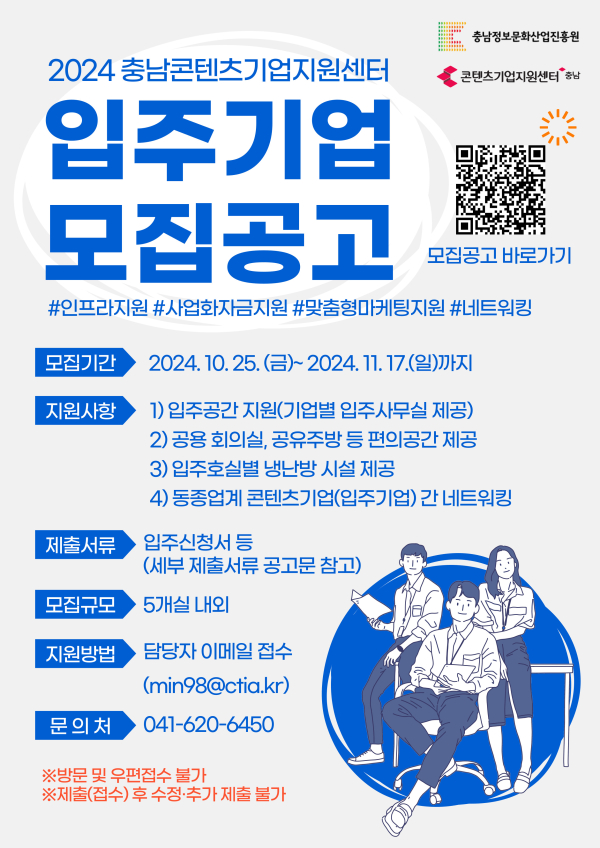 [충청뉴스 박동혁 기자] 충남정보문화산업진흥원은 충남콘텐츠기업지원센터(이하 센터) 신규 입주기업을 모집한다고 12일 밝혔다.